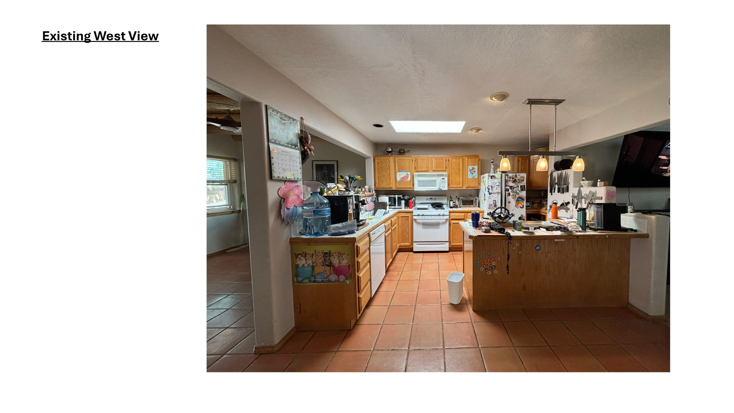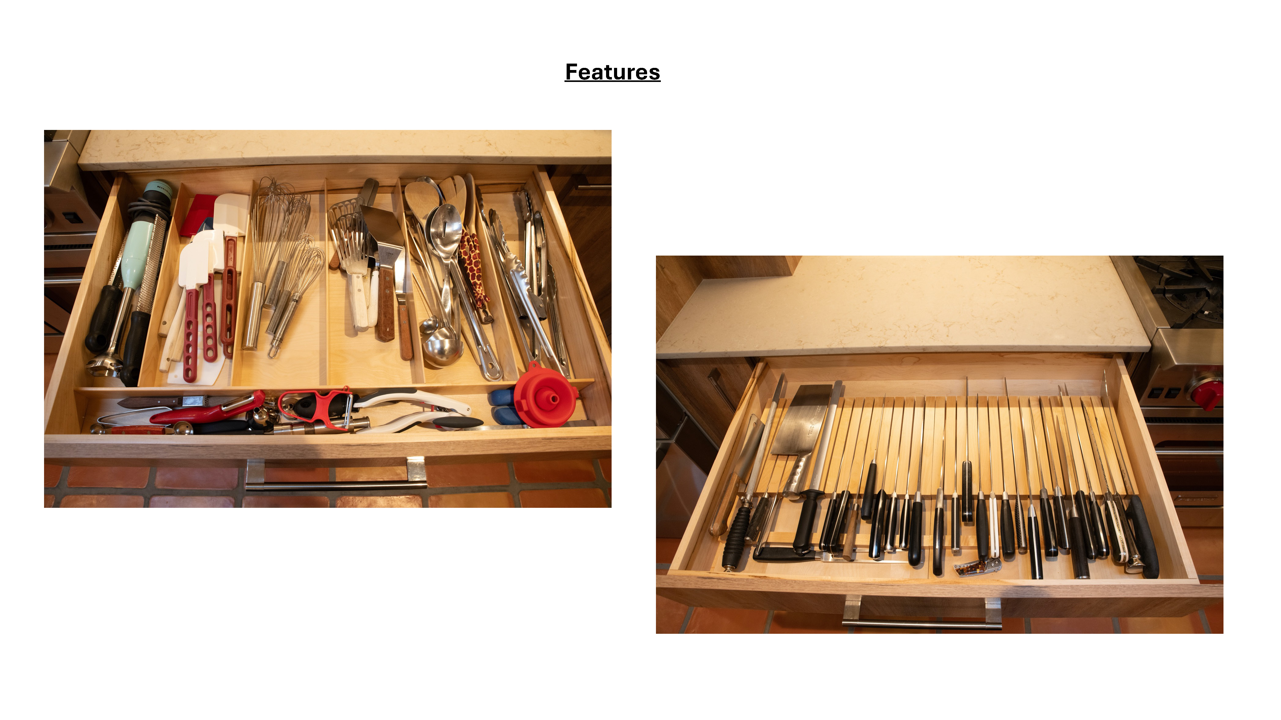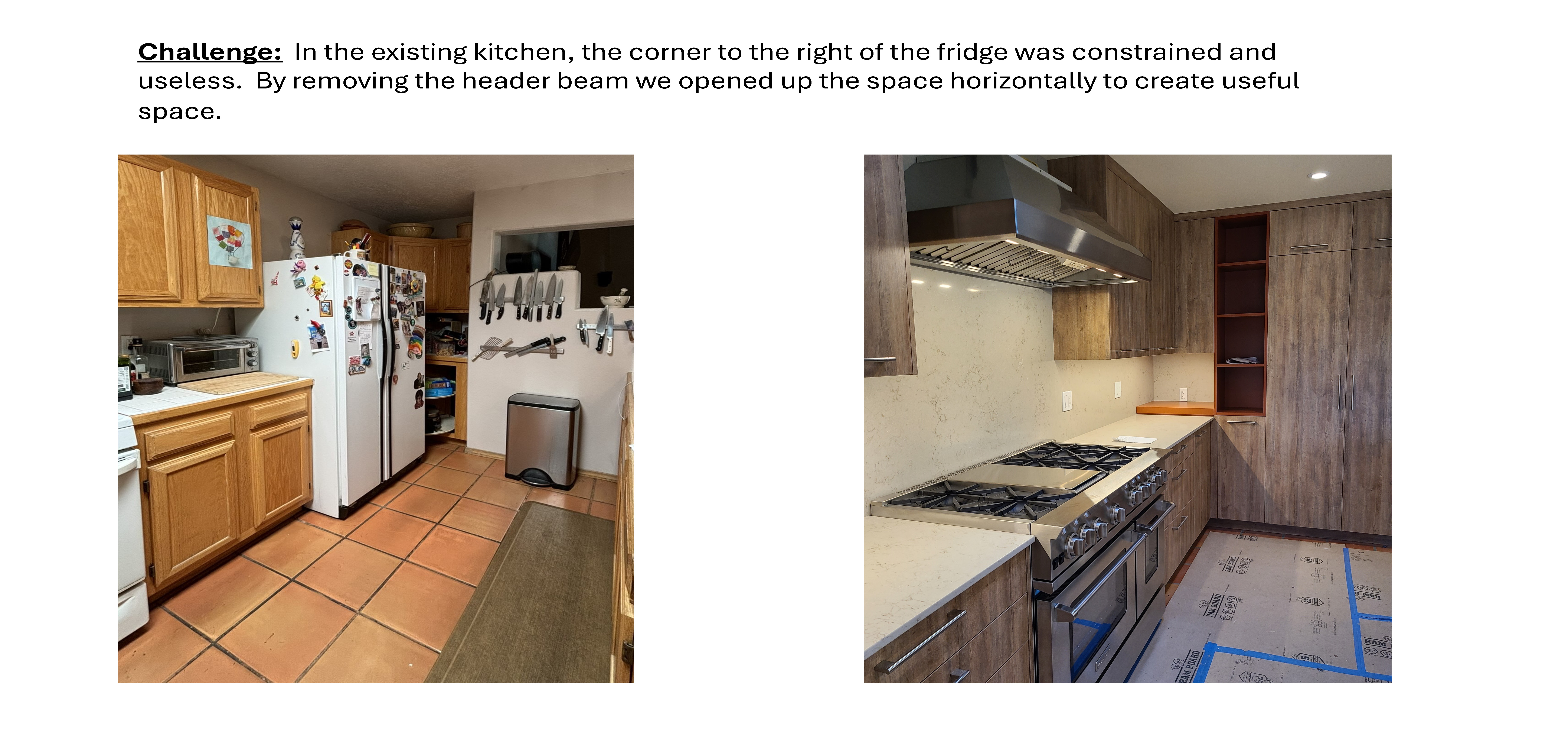 As the kitchen renovation progressed, the homeowners realized that their outdated living room also needed upgrades. They opted for modernized finishes and additional storage solutions to better suit their lifestyle. DMC introduced new Saltillo tile throughout the remodeled areas, including the living room, with expert installation by Rivera Tile Works. McAdams and Sons masterfully fabricated and installed new hardwood flooring, replacing old, creaky, and peeling stair planks. The team also repositioned the front door, which had previously created a pinch point with the stairs, allowing space for a small yet functional foyer. A custom stair rail cap, fabricated by DMC, now frames the home’s entrance with intentional, refined details.